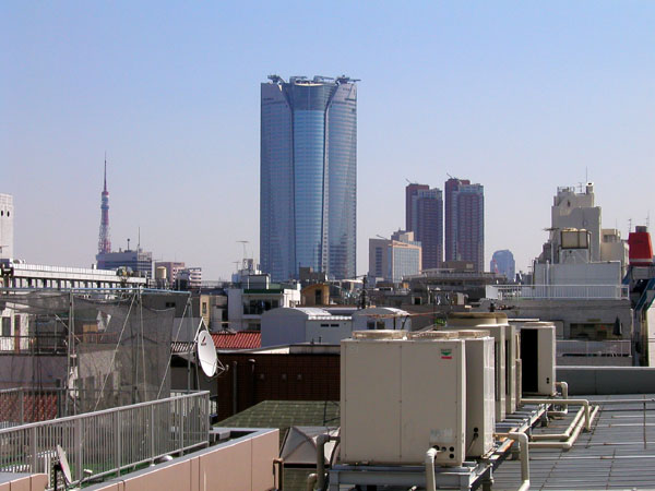 でも何より好きなのは、この窓からの不思議な眺め。目線と同じレベルに雑多な住居、安アパートやボロビルの屋上などがずらりと並ぶ。その雑多な屋根が形成する地平線の向こうに、不意に近代的な高層ビルや東京タワーがニョッキリ生えている。このコントラストが、どーも俺には「攻殻機動隊」の世界をイメージさせてしまうのである。生活層、貧富というモノがエリアによって明確に区切られた、あるいはこれからの日本が本当に向かうかもしれない世界。その雛型となる風景はこんなんかなぁ、などとぼんやり考えながら。