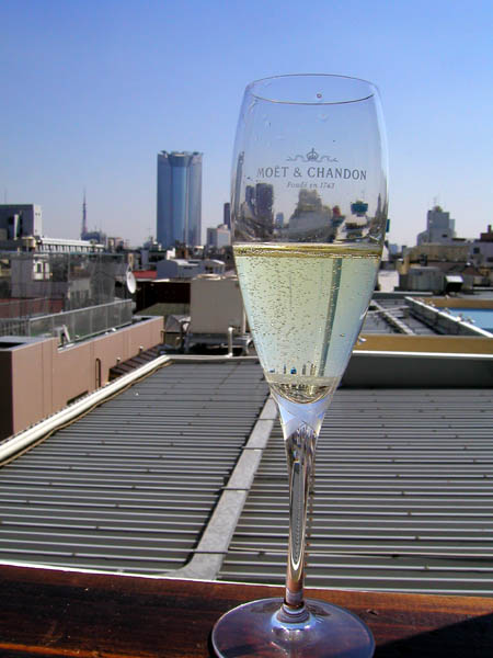 ともあれ、よく晴れた日など、一番奥の窓際の席を占領し、ヒビの入った窓を開けて、この窓からの眺めを広い空と共に味わうのが、格別の週末の昼ってモンである。あまりに心地よかったので昼間から酒をかっ食らい、MoetのCMみたいな写真まで(中身はただの安いスパークリングであってシャンパンではありません)撮ってしまったり:)