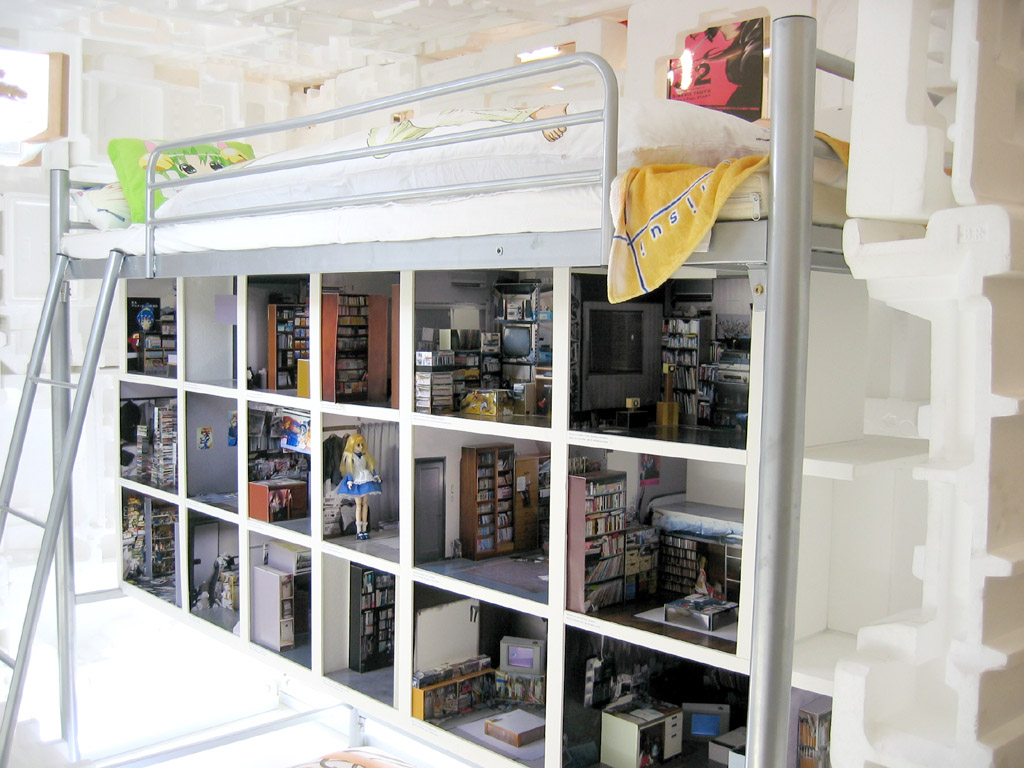 また「オタクの部屋」のミニチュア展示には思わず大爆笑。ご丁寧に展示自体が収納ベッド仕立て、おまけに上はでじこ枕に抱き枕、リネン部という丁寧さである!(笑) あまりに大爆笑してしまい、リアルすぎて笑っちまったんだよ、と周りのイタリア人に弁解するのが大変であった。もー自室プロジェクタさんから1/1設置屋さんから大雪崩直前やら同人腐女子デスクやら! その横には「オタクの本棚」と称したミニチュア本棚があり、そのラノベとコミックが雑然と並ぶ様が実にリアル。